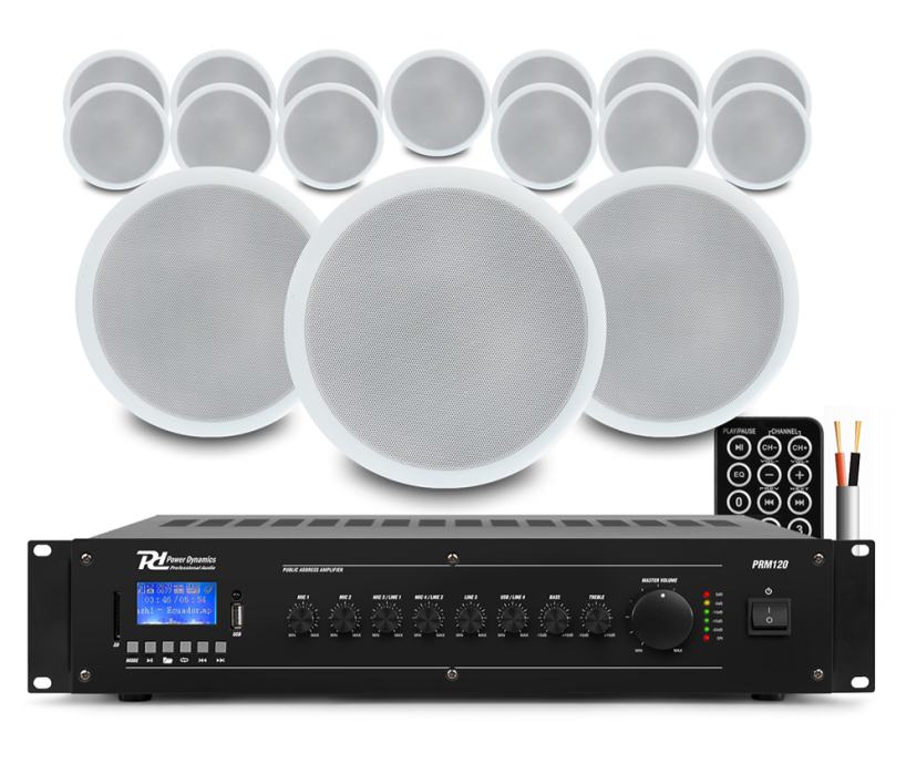 Komplet ozvočenje z vgradnimi knauf zvočniki, primerno za lokale, ordinacije, bare, podjetja, dom in podobno..