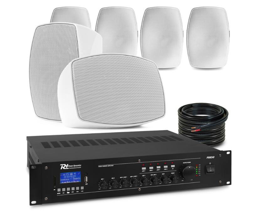 Komplet ozvočenje z stenskimi zvočniki, primerno za lokale, ordinacije, bare, podjetja, dom in podobno.