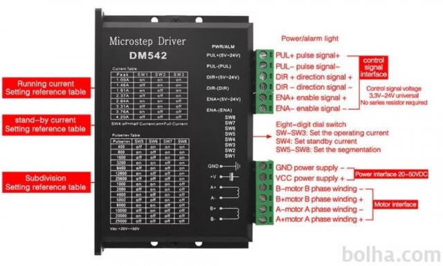 Prodam DM542 driverje za koračni motor. Driver omogoča microstepping do 1/256, maksimalen tok 4,2 A. Uporabljajo se lahko za pogon najrazličnejših vrst koračnih motorjev.