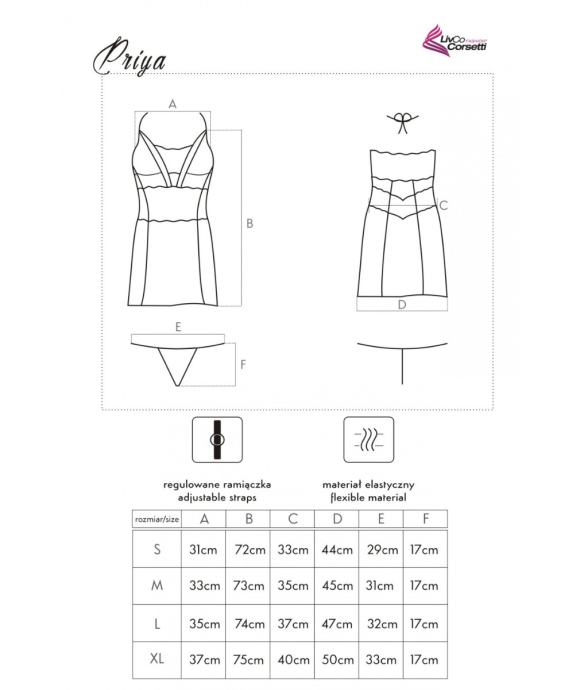 Z negližejem Priya bo vsaka ženska, ki ga nosi, izžarevala čutno eleganco. Še več, kombinacija satena in dovršene čipke ji bo dodala ženstven in nadvse mamljiv videz. Priya na res čudovit način poudari oprsje, ramena in vrat. Čudovit kroj bo nežno objel vaše obline in izpostavil vaše atribute. Material je svilen na dotik in je v kombinaciji s čutno čipko na pasu in prsih, ki preusmeri pogled in vas naredi še bolj zapeljive. V kompletu prejmete tudi ujemajoče tanga hlačke.
