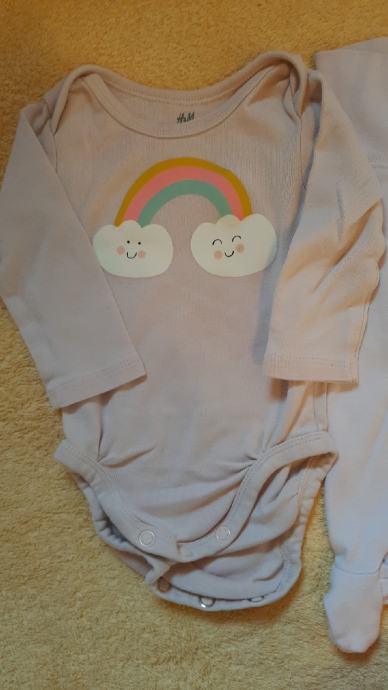V kompletu prodam izredno mehko in toplo jopico s kapuco, bodi, majčko in dvoje hlačke s stopali za deklico.