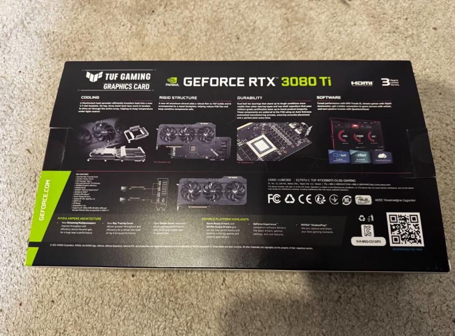Prodajam ASUS TUF RTX 3080 Ti grafično kartico z 12 GB pomnilnika. Uporabljena približno eno leto, samo za igre, brez rudarjenja ali težjih nalog. Kartica je v odličnem stanju, deluje brezhibno in ni overclockana.