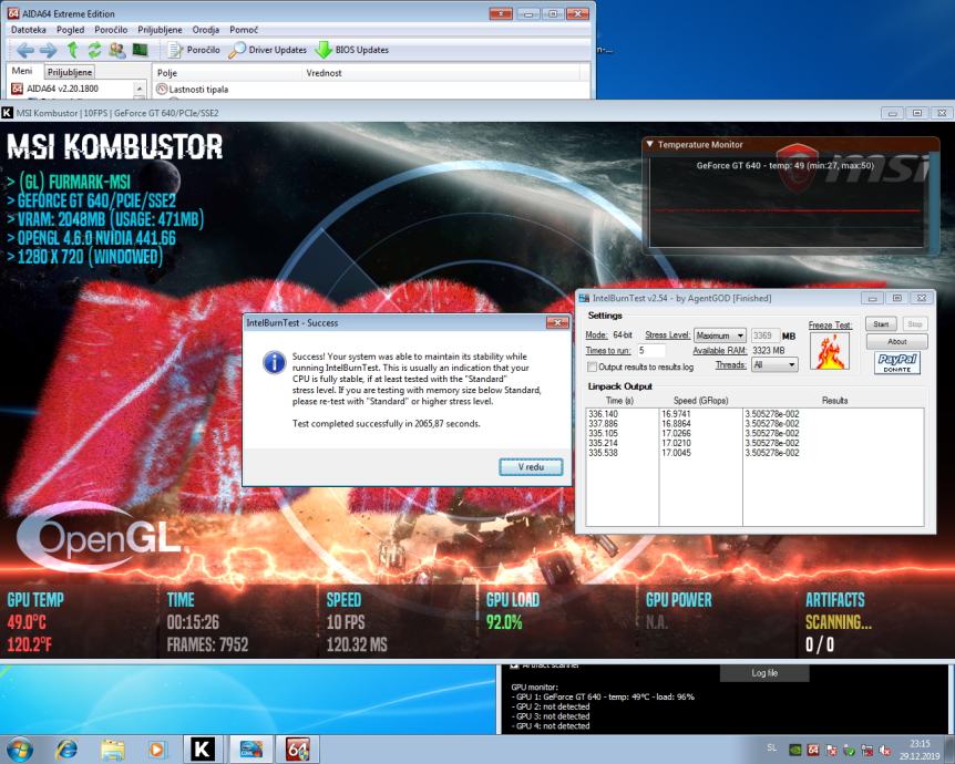 Procesor je bil stestiran z programom IBT (glej sliko 1) in ujemajoče številke v stolpcu RESULTS, nakazujejo na brezhibnost le-tega. Grafično kartico se je obremenilo z programom MSI Kombustor (glej sliko 1) in spodaj desno kjer piše artifacts - 0/0 pomeni da grafična deluje prav tako brezhibno. Slika 3 prikazuje zdravje/brezhibnost delovnega spomina.