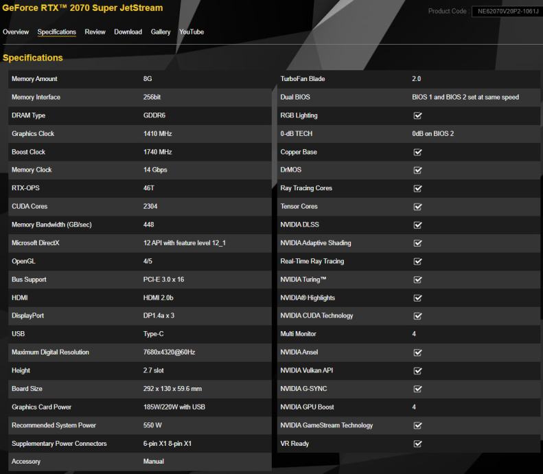 Specifikacije lahko najdete med slikami, tukaj pa tudi uradni link - https://www.palit.com/palit/vgapro.php?id=3097&lang=en&pn=NE62070V20P2-1061J&tab=sp