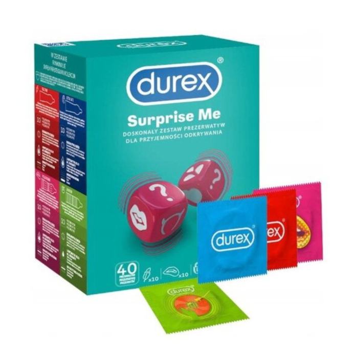 Pustite se presenetiti z mešanico kondomov Durex Suprise Me! Komplet Suprise Me vključuje 40 Durex kondomov oziroma štiri različne tipe kondomov, primernih za različne priložnosti. S temi kondomi boste poskrbeli, da bo zaščita vedno na dosegu roke. Komplet Suprise Me vključuje kondome: Extra Safe, Tickle, Pleasuremax in Sensitive. 10x Extra Safe: D 190 mm, Š 56 mm; Kondomi Extra Safe so izdelani iz nekoliko debelejšega lateksa od standardnih kondomov, in nudijo dodatno varnost med spolnimi odnosi. Kondomi so prosojni, gladki in imajo dodan lubrikant. 10x Arouser: D 190 mm, Š 53 mm: To so stimulativni rebrasti kondomi, ki so zasnovani tako, da nudijo dodatno stimulacijo med spolnimi odnosi. Ko si zaželite še bolj razburljiv seks, izberite Arouser. 10x Feel Thin: D 190 mm, Š 56 mm: To so izjemno tanki, transparentni kondomi ob katerih boste pozabili, da nosite zaščito. Kljub temu, da so zelo tanki pa nudijo enako visoko stopnjo zaščite kot drugi. 10x Pleasuremax: D 190 mm, Š 56 mm: Te kondomi bodo spodbudni za oba partnerja saj imajo edinstvno posravljene rebre in pike, ki stimulirajo intimne predele med spolnimi odnosi. Kondomi Durex Suprise Me so dermatološko testirani in 100% elektronsko preizkušeni za popolno varnost.