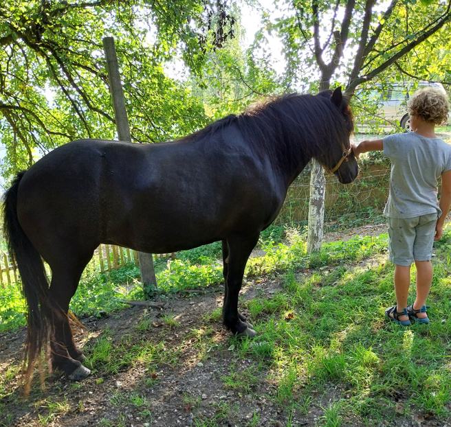 Kobila je stara 9 let, temno rjave barve. Je prijazna, vajena paše v ogradi (električni pastir), zdrava, brez ekcema ali drugih zdravstvenih posebnosti. Še ni brejila. Ni ujahana. Telefon: 041-622-113.