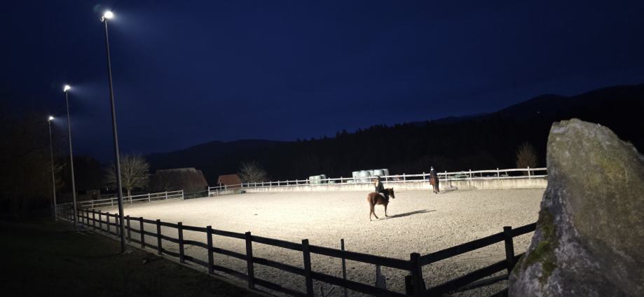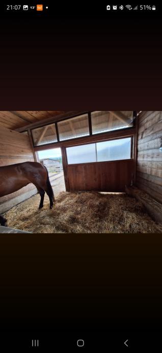 Oskrba zajema vsakodnevno kidanje, seno ali senaža 24/7, nastilj slama, možnost dodajanja krmil, izpust, maneža velikosti 70x30 ( za nočna jahanja je na voljo razsvetljava), moznost treninga konja in vas, prevoze konj, pomoč in svetovanje....