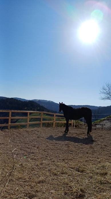 Prodam kobilo križano med anglo-arabcem, stara je 8 let in visoka okoli 150 cm. Kobila je jahana po terenih in v maneži. Občasno zna biti temperamentna, ampak je obvladljiva, ni pa primerna za začetnike. Na terenih je neboječa. Trenutno je jahana western, zraven lahko tudi prodam njeno western sedlo. Je kovana in nikoli ni bila poškodovana.