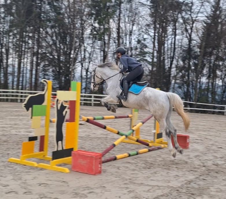 Skače do višine 1m (tudi z začetniki), ima potencial za več, izredno primeren tudi za terensko jahanje, ni plašen.