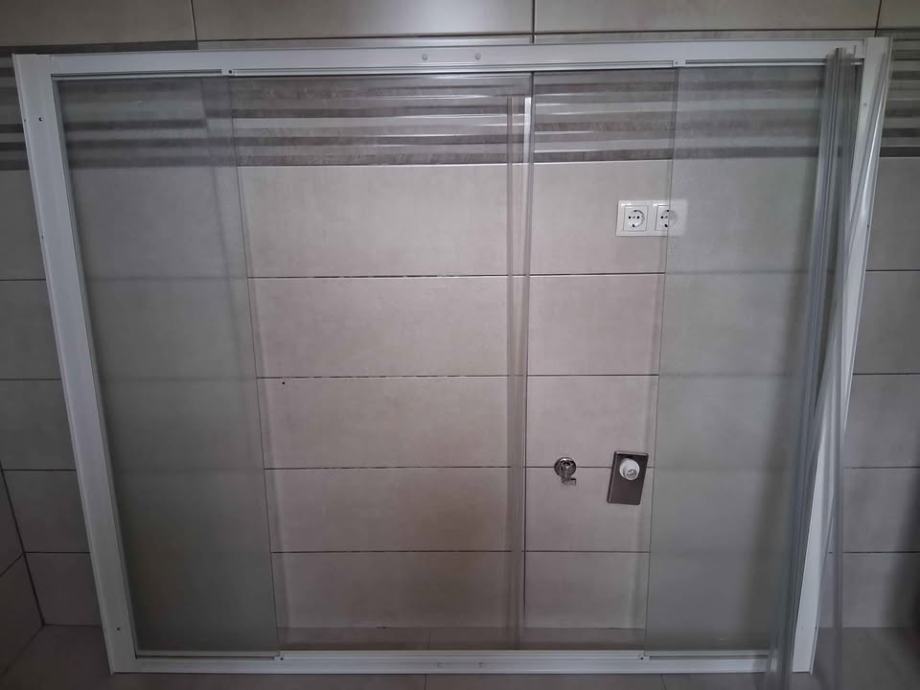 Paravan Pandora 2D...dvostruka klizna vrata..boja profila bijela...kaljeno.staklo 6 mm...staklo reljef...premaz proziv kamenca..177-182 cm duzina...visina 1.50 m