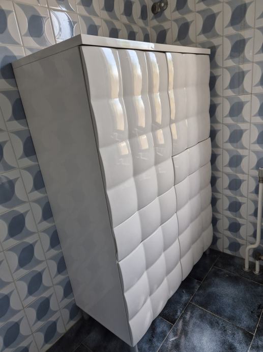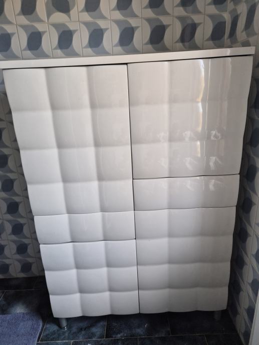 Prodamo kopalniško samostojno stoječo omaro v beli barvi z dvema predaloma in štirimi omaricami, odpira se na dotik. Stoji na nogicah. Dobro ohranjena.