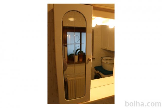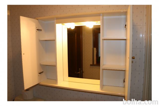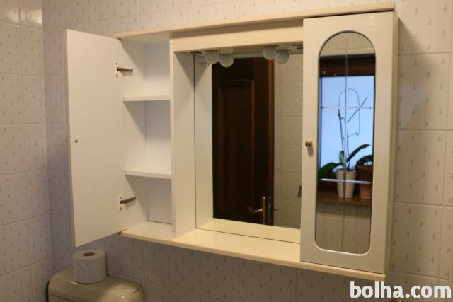 Lesena kopalniška omarica z ogledaloma v ratih, dvema žarnicama in vtičnico za brivski aparat