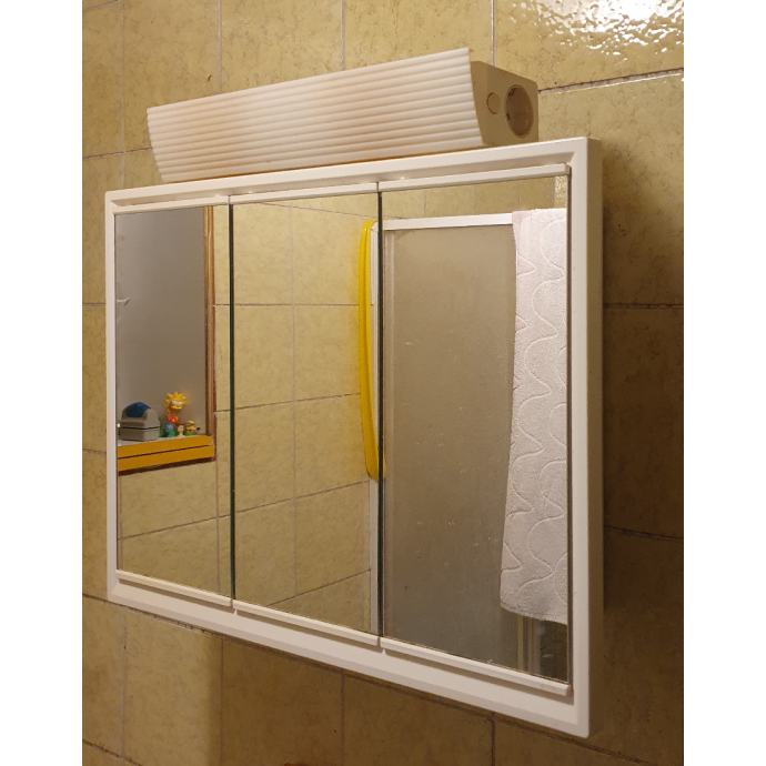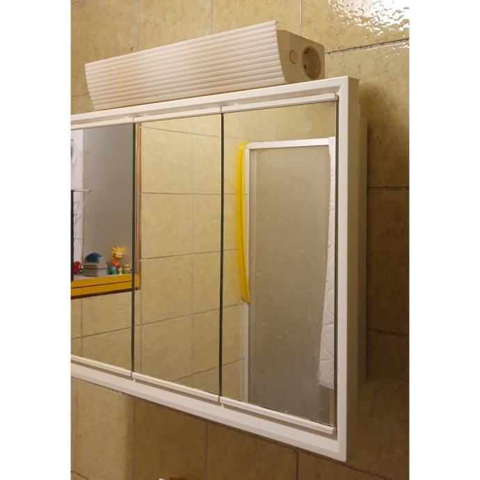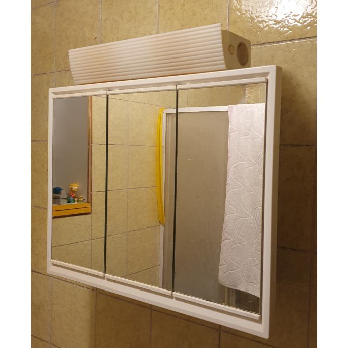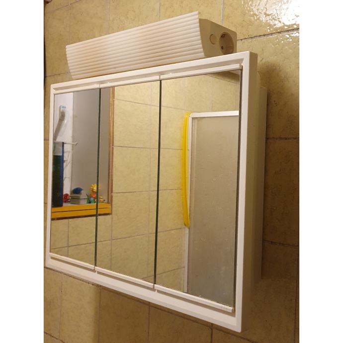 Kopalniška omarica z ogledalom - ( LUČ - VTIČNICA - SHRANJEVALNA ) - SHRANJEVALNI PROSTOR V VSEH TREH DELIH, ki se odpirajo - V VSAKEM PO ENA POLICA - ( Dve luči na mali navoj in stikalo za vklop / izklop luči - Vgrajena tudi vtičnica za tok ) ...