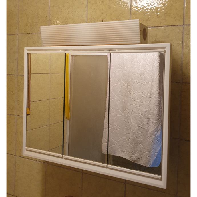 Zaradi spraznitve prostora prodam kopalniško omarico dimenzije cca. 58 cm širina x 42,5 cm višina ( 50 cm z lučjo na vrhu ) x 17,5 cm globina.