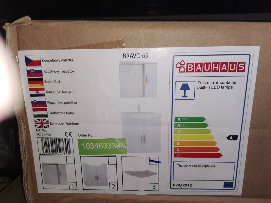 Kopalniški komplet Bravo 65 je sestavljen iz ogledala z LED osvetlitvijo, stranske omare, vgrajenega keramičnega umivalnika