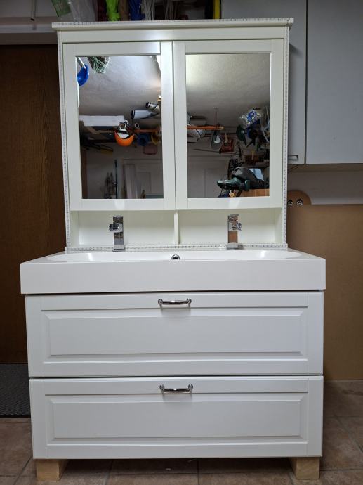 Zaradi prenove kopalnice, prodajamo nekaj kosov, ki jih ne bomo več uporabili. Kopalniški sestav bele barve Ikea vsebuje poleg podumivalniške omarice z dvema predaloma (širina 100cm) tudi dvojni umivalnik s pipama, ter omarico z ogledalom. Dobro ohranjeno, uporabljali smo jo cca 5 let. Zraven prodamo tudi radiator(25 let), paravan za kad(5 let) in harmonika vrata(1 leto).