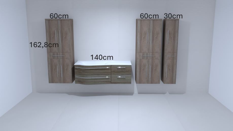 Sestav kot je na sliki. Vse omarice so v barvi hrast tartuf, malo temnejši hrast.
