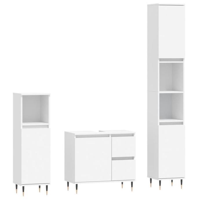Ta trendovski komplet kopalniškega pohištva je odličen dodatek k vaši kopalnici, saj ji daje urejen in osupljiv videz! Vzdržljiv material: Inženirski les se ponaša z izjemno kakovostjo, gladko površino ter močjo, stabilnostjo in odpornostjo na vlago. Železne noge: Železne noge dodajo vašim notranjim prostorom sodoben in umirjen slog, hkrati pa zagotavljajo stabilnost.Veliko prostora za shranjevanje: Kopalniška omarica zagotavlja različne možnosti shranjevanja in prostoren prostor za shranjevanje predmetov v kopalnici. Praktičen dizajn: Zgornji del kopalniške omarice je idealen za namestitev umivalnika. Opozorilo:Za preprečitev prevračanja je treba ta izdelek uporabiti s priloženo napravo za pritrditev na steno. Dobro je vedeti:Umivalnik ni priložen.Vijaki in čepi za notranjost stene niso priloženi. Svetujemo vam, da poiščete in uporabite vijake in zatiče, ki so primerni za vaše stene. Če niste prepričani, se lahko posvetujete s strokovnjakom. Preberite in upoštevajte vse korake v navodilih.