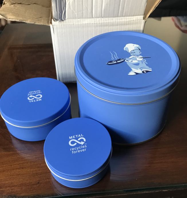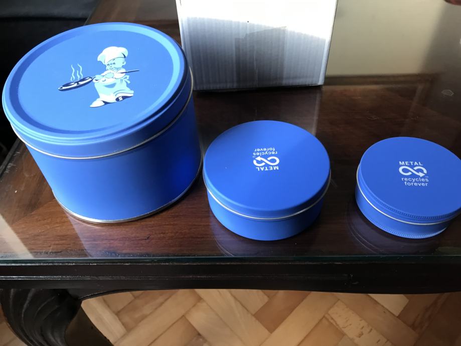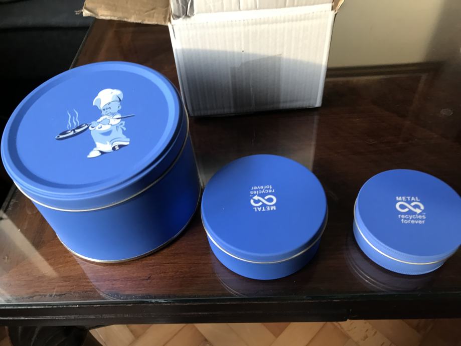 Prodam nove kovinske škatle v modri barvi z naslijanim motivom kuharčka. Meri največje škatle so: višina 9 cm, premer 13 cm. Ostali dve sta manjši.