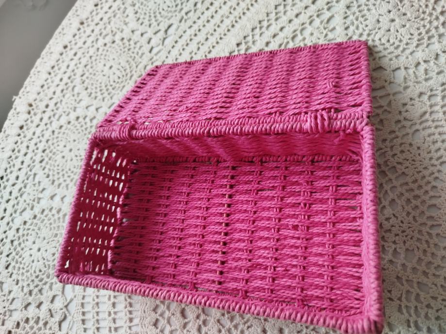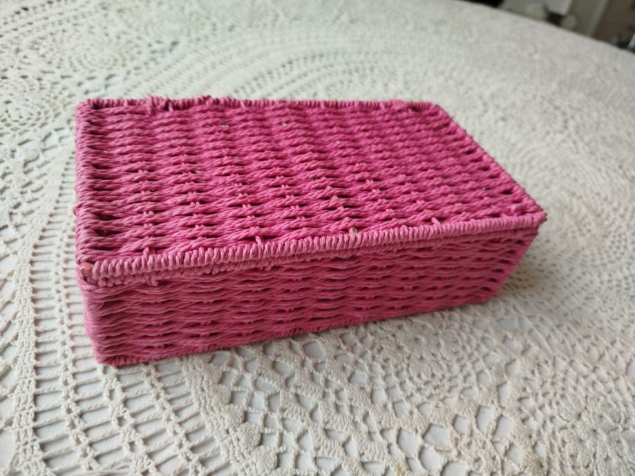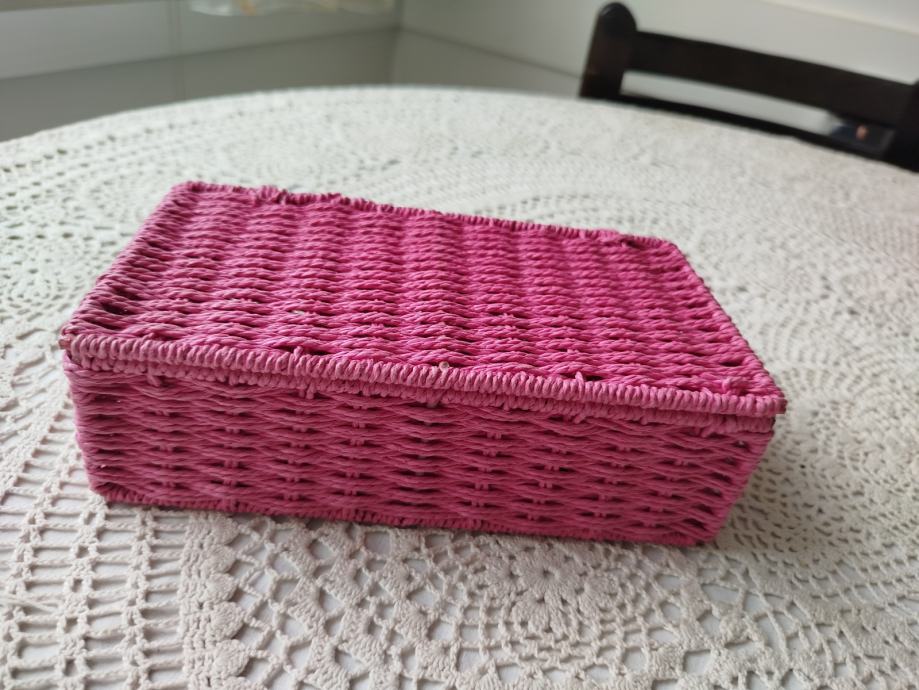 Lepa škatla iz obarvane pletene vrvi, stranice ojačane s kovinskim