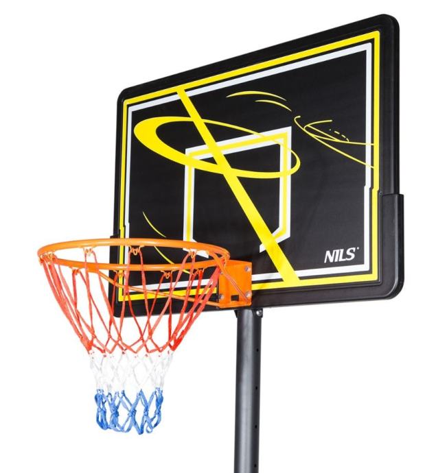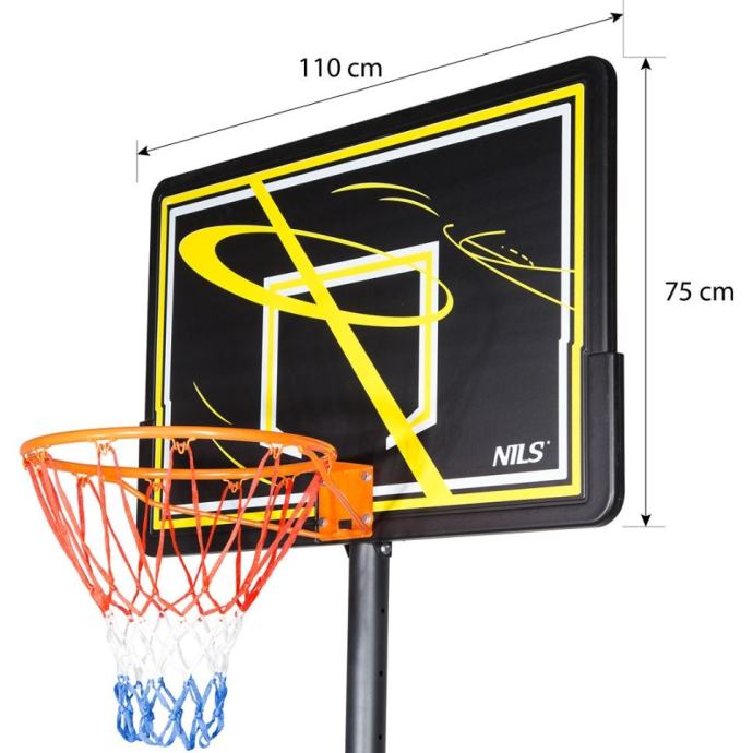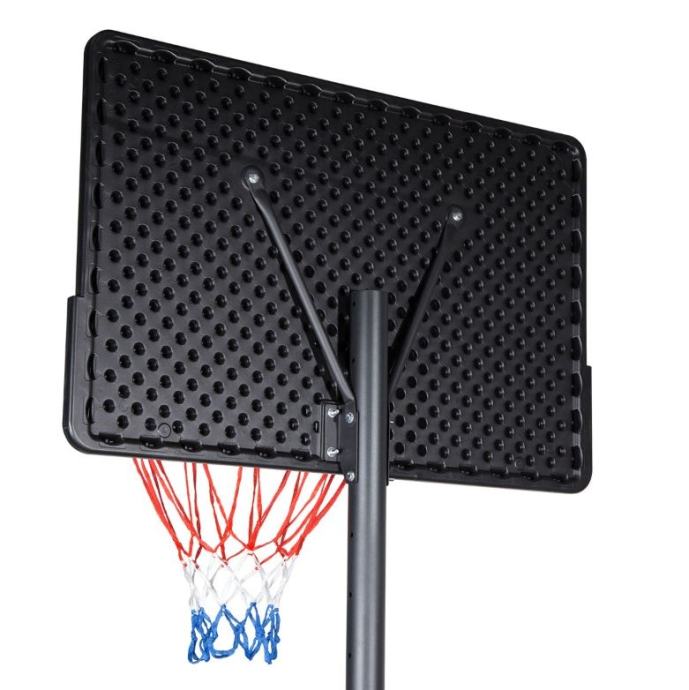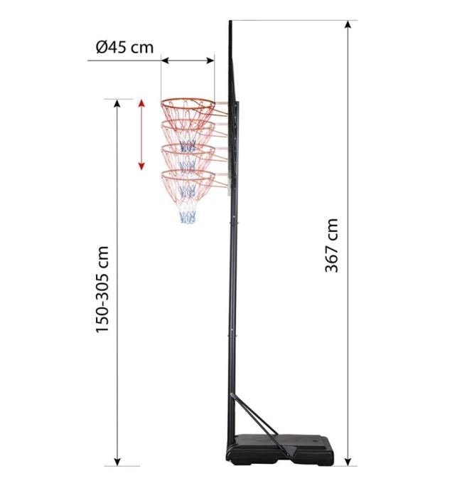Košarkarski koš za otroke, mladino in odrasle je primeren za zunanjo in notranjo uporabo. Plošča velikosti 110 x 75 centimetrov je izdelana iz polietilena in prenese tudi najmočnejše udarce. Trden jeklen koš s premerom 45 centimetrov dopolnjuje mreža. Podstavek velikosti 90 x 60 centimetrov lahko sprejme 54 litrov vode za maksimalno stabilnost koša. Za dobro mobilnost je podstavek opremljen s kolesi za enostavno premikanje. Višino spremenite s pritrditvijo nosilca na zadnji strani plošče na eno od 14 stopenj. Višino koša je mogoče nastaviti od 1,5 do 3,05 metra.
