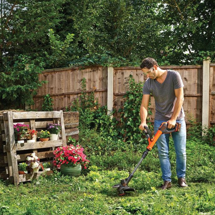 Z akumulatorsko kosilnico na nitko Black+Decker STC1840EPC s Powercommand Easy Feed 18 V 4 Ah lahko hitro in natančno obrežete divjo podrast, koprive, osat, plevel in naravne trate. Rezalna glava ima premer rezanja 30 cm, s katerim še posebej visoko in mokro travo na večjih površinah kosite zdravo in čisto. Z malo truda lahko svojo zunanjo površino oblikujete lepo in urejeno.Učinkovit sistem rezanja in Powercommand Easy FeedPatentiran pogon zobnikov (E-Drive) dosega stalno visok navor in visoko zmogljivost. Funkcija Powercommand Easy Feed vam omogoča samostojen nadzor nad orodjem pri obrezovanju trave in robov. To vam omogoča nadzor, kdaj in ali se nit s pritiskom na gumb podaljša. Delo lahko nadaljujete takoj po pritisku na gumb. Trata in naprava se zavarujeta, ker podaljšek niti ne pušča sledi.Funkcija obrezovanja robov in ročna nastavitevRezalno glavo lahko obračate brez orodja, kar vam olajša rezanje navpičnih robov z vodilnim kolesom in obrezovanje težko dostopnih mest, npr. pod mizami, vrtnimi klopmi ali trampolini. Višino akumulatorske kosilnice z nitko Black+Decker lahko s teleskopskim ročajem vselej prilagodite telesni višini. To vam omogoča pošteno in hrbtenici prijazno delo. Nastavljiv drugi ročaj zagotavlja dodatno udobje in varen prijem. Na ta način si lahko svoj vrtni trimer optimalno prilagodite različnim potrebam.Močan akumulator in kar največji nadzorAkumulatorska kosilnica na nitko Black+Decker deluje brez kabla, njena zmogljiva baterija pa vam zagotavlja največjo svobodo gibanja. Litij-ionski akumulator deluje na napetost 18 V, polni pa se s polnilnikom 4 Ah. Z delovanjem akumulatorske baterije do 75 minut je akumulatorska kosilnica na nitko Black+Decker še zlasti primerna za večje površine. S hitrim polnilnikom lahko baterijo popolnoma napolnite v dveh urah. Z možnostjo predhodne izbire števila vrtljajev imate optimalen nadzor nad delovanjem orodja, sami pa se lahko odločite, ali naj deluje s polno zmogljivostjo (način Turbo) ali kar najdlje (način Eco).Komplet vključuje:Akumulatorska kosilnica na nitko Black+Decker STC1840EPCLitij-ionski akumulator 18 VHitri polnilnikEnojna nitka 9 m/1,6 mmEasy Feed podaljšek nitke