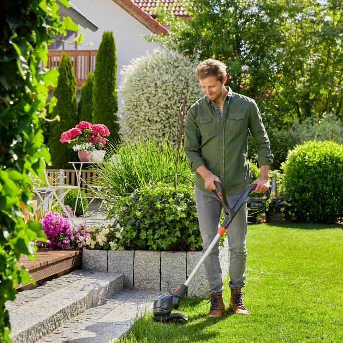 S priročnim in lahkim električnim trimerjem ComfortCut 23/18V P4A lahko udobno uredite dolge travne robove in teže dostopna mesta na vrtu. Nastavljiv teleskopski ročaj in posebno velik dodatni ročaj poskrbita za sproščeno pokončno telesno držo in olajšata vodenje naprave. Striženje na težko dostopnih mestih lajša ukrivljeni ročaj. Vrtljiva rezalna glava omogoča natančno navpično striženje visečih travnih robov. Pri obrezovanju v bližini gredic in robnikov lahko ščitnik za rastline raztegnete. Rezalni sistem RotorCut s trpežnimi plastičnimi rezili reže še zlasti tiho, natančno in čisto. V kompletu sta tudi akumulator in polnilnik. Z energijo napaja sistemska baterija 18 V zavezništva Power4All Alliance, ki temelji na akumulatorski tehnologiji Bosch. Ta ustreza vsem novim vrstam vrtnih orodij 18 V zavezništva Gardena Power4All Alliance, lahko pa se uporablja tudi s številnimi izdelki drugih blagovnih znamk iz zavezništva, uporabnih za celoten dom.