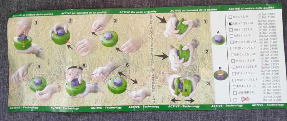 Glava je nova za univerzalno montazo na vse lakserice z navojem M8x1,25. Glava se napelje brez razstavljanja. Zraven je vgrajen tudi cel kolut kvalitetnega kvadratnega laksa debeline 2,5mm.