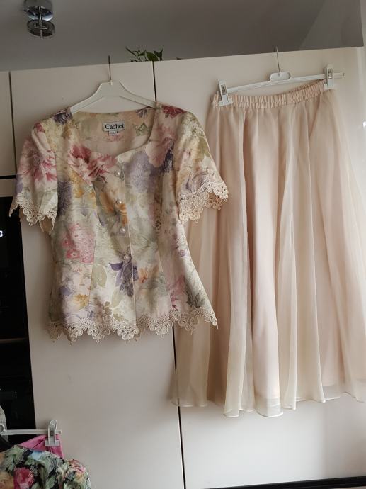 Jakna v kombinaciji s čipko je satenasta in meri od ene pazduhe do druge 48cm,