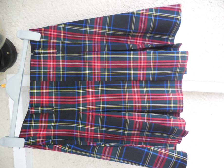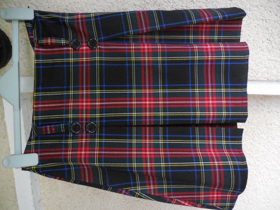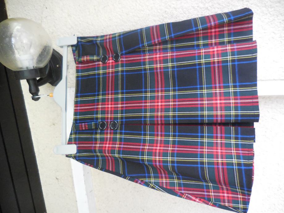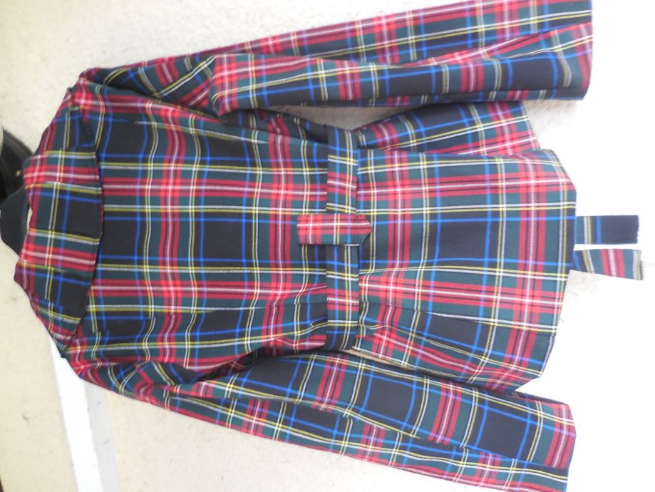 Popolnoma nova komplet krila in jakne na črni osnovi z reče modro zelenimi črtami. Jakna je velikost L, krilo je velikost S. Jakna je podložena, zapenja se spredaj z gumbi in ima pas ter 2 žepa. Krilo ni podloženo in ima 2 favda ter na sprednji strani po 2 okrasna gumba.
