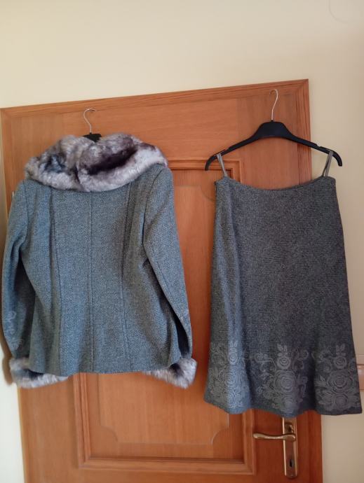 Nošen samo 1x, višjega cenovnega razreda (volna, viskoza), zelo kvaliteten, krilo je podloženo in meri v pasu 36cm, dolžina je 63cm, jakna je podložena, ni raztegljiva od ene pazduhe do druge meri 50cm, od enega ramenskega šiva do drugega je 42cm, dolžina je 60cm, sestava je 40% volna, 60% viskoza, ne menjam, ptt ni vključena v ceno