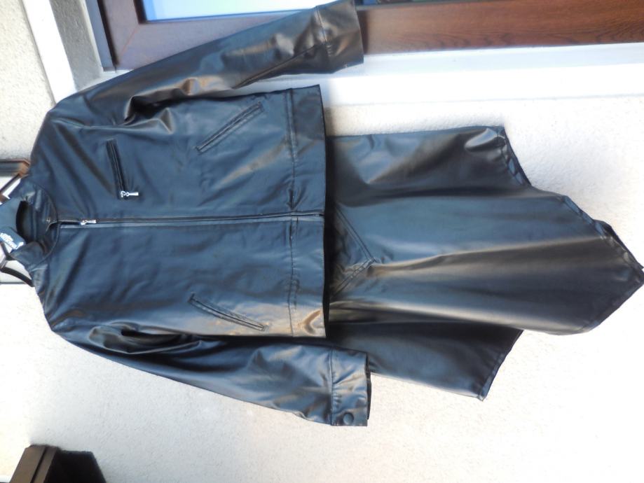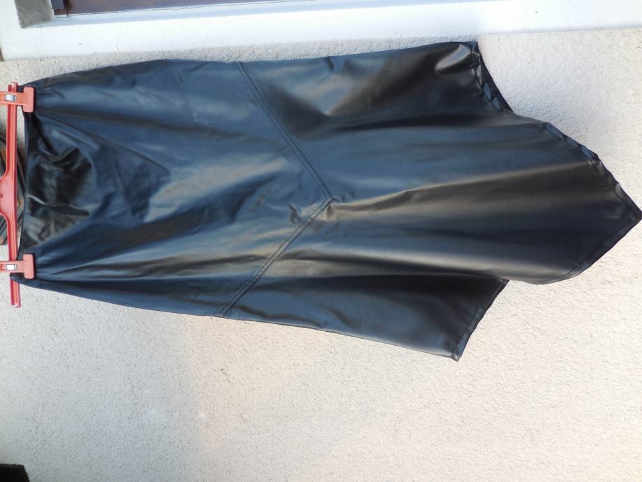 Nenošen črn komplet krila iz jakne iz umetnega usnja. Komplet ni podložen in ni raztegljiv. Krilo je maxi (do gležnjev) , spodaj rezano v karo, zapenja se ob strani na zadrgo. Jakna se zapenja na zadrgo, ob strani ima dva žepa.