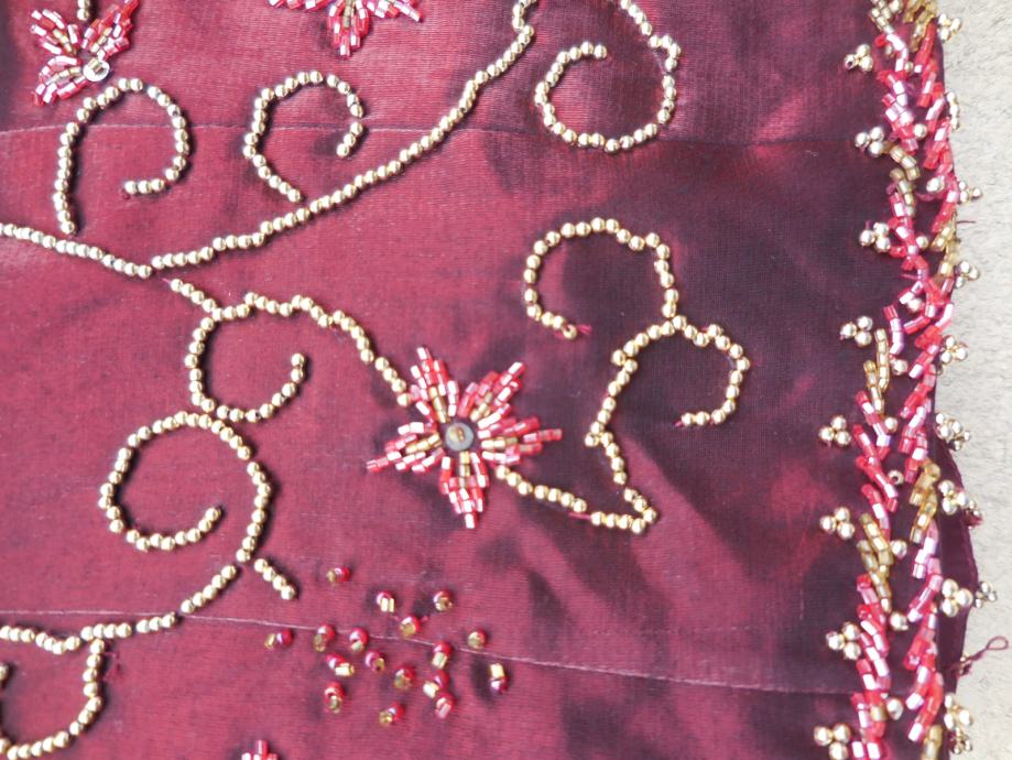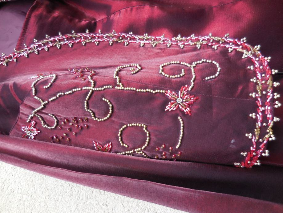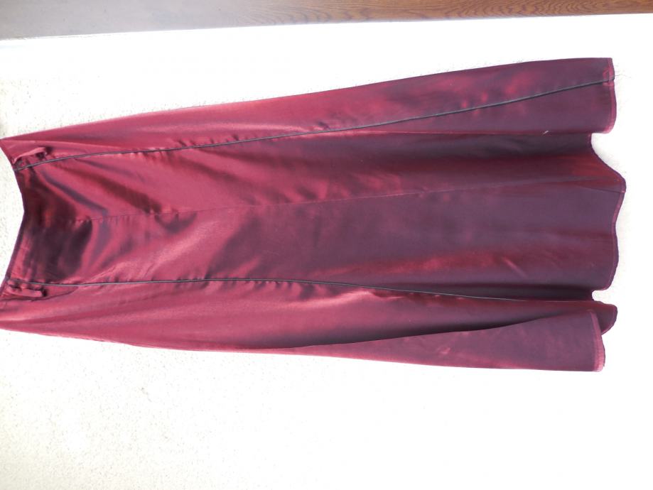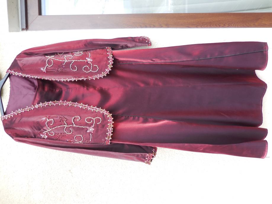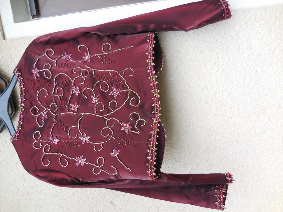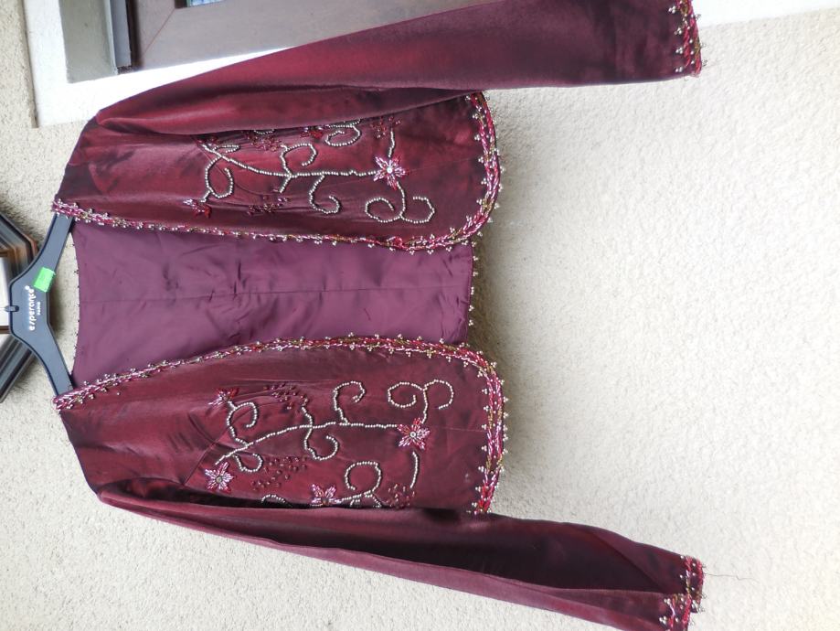 izjemno lepo ohranjen vintage vinsko rdeč komplet krila in jakne. Krilo je dolgo in sega do pete, jakna ima čudovite datajle našitih zlatih in rdečih perilc in okraskov. Komplet ni raztegljiv in je v resnici malo temnejše barve kot na sliki.