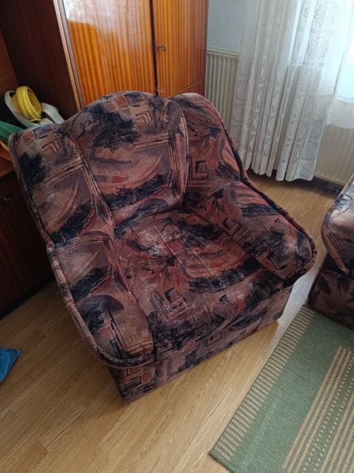 Prodam kotno sedežno garnituro (255 x 155 cm) in fotelj (85 x 90 cm). Kavč se raztegne, kot je vidno na fotografiji. Za 10 € zraven pride tudi mizica na sliki (120 x 50 cm). Za odvoz poskrbite sami.