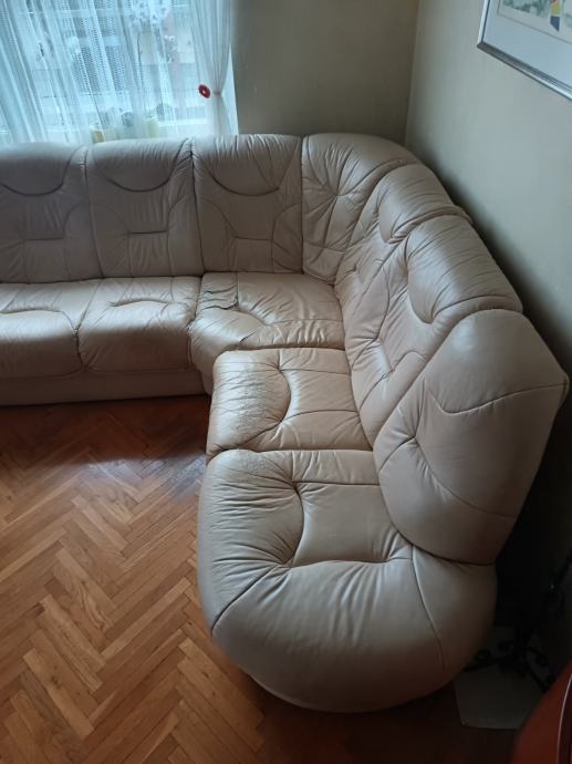 Podarjam rabljeno usnjeno kotno sedežno garnituro v bež barvi. Garnitura je udobna in prostorna. Kljub vidnim znakom uporabe je še vedno uporabna in lahko služi novemu lastniku.
