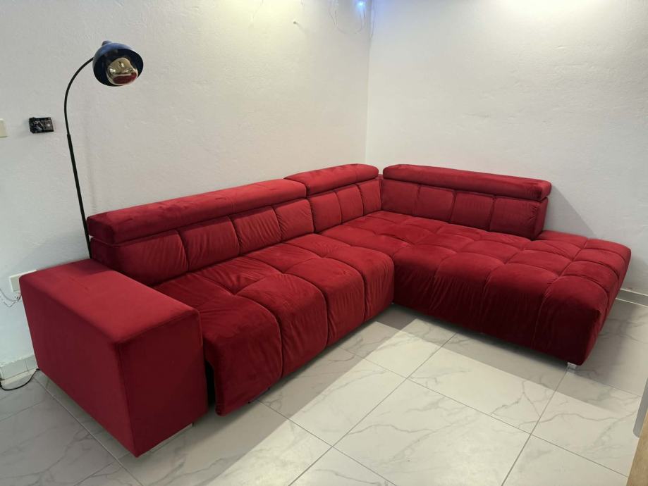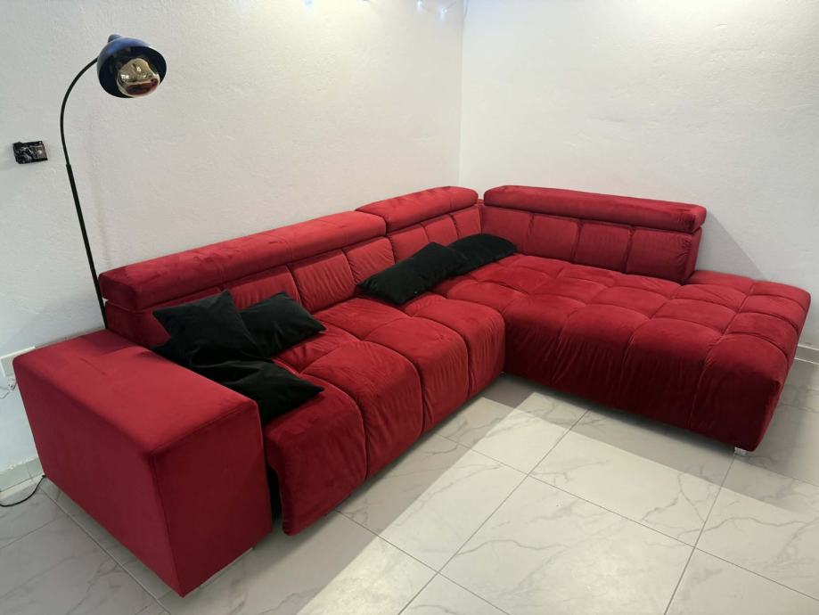 Prodajam rabljeno kotno sedežno garnituro v živahni rdeči barvi. Zelo udoben in mehek kavč ima moderno obliko z debelo oblazinjenimi sedalnimi površinami in široko ležalno površino na desni strani na L.