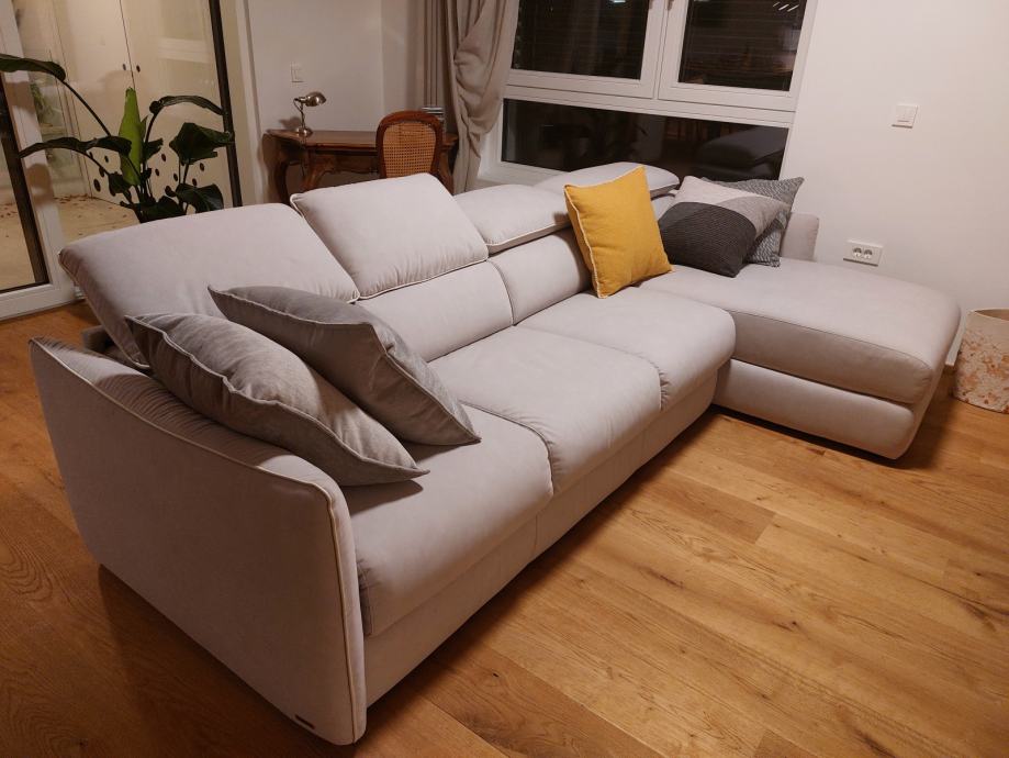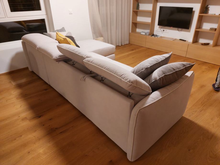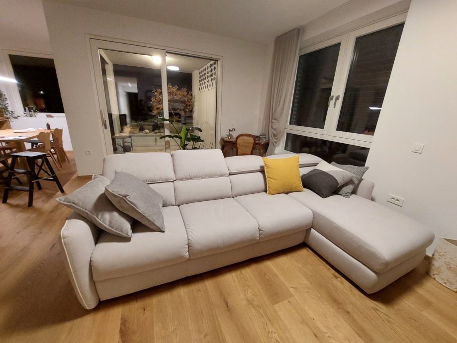 bež barve, material Aquaclean in izvlečljiva naslonjala. Nerabljen, ker se stanovanje ni prodalo in novi lastnik želi drugačen kauč.