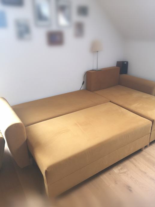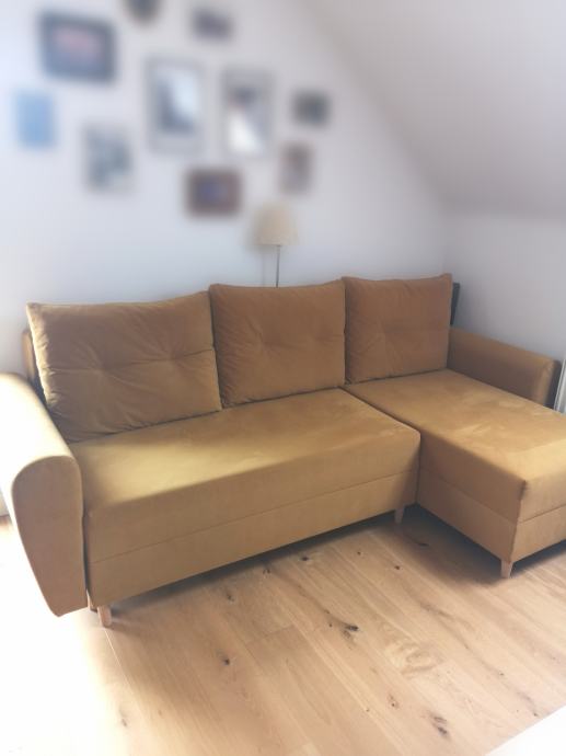 Praktično nerabljena sedežna garnitura, kavč. Možnost ležišča, priročen predal za shranjevanje, lesene nogice, lepa barva, hvaležen material.