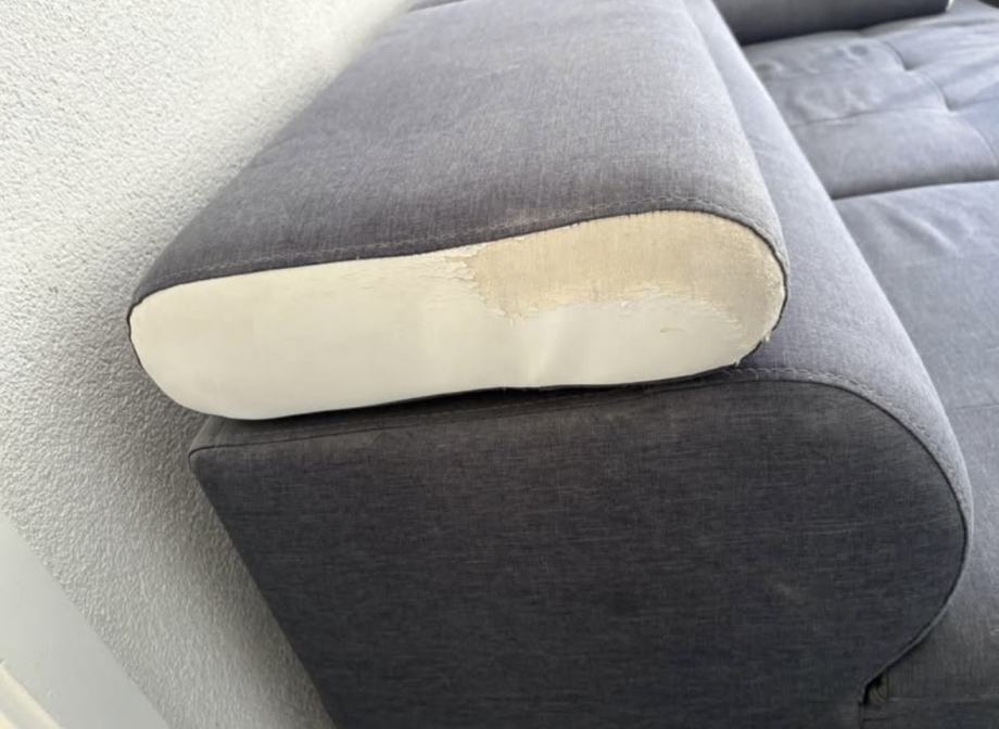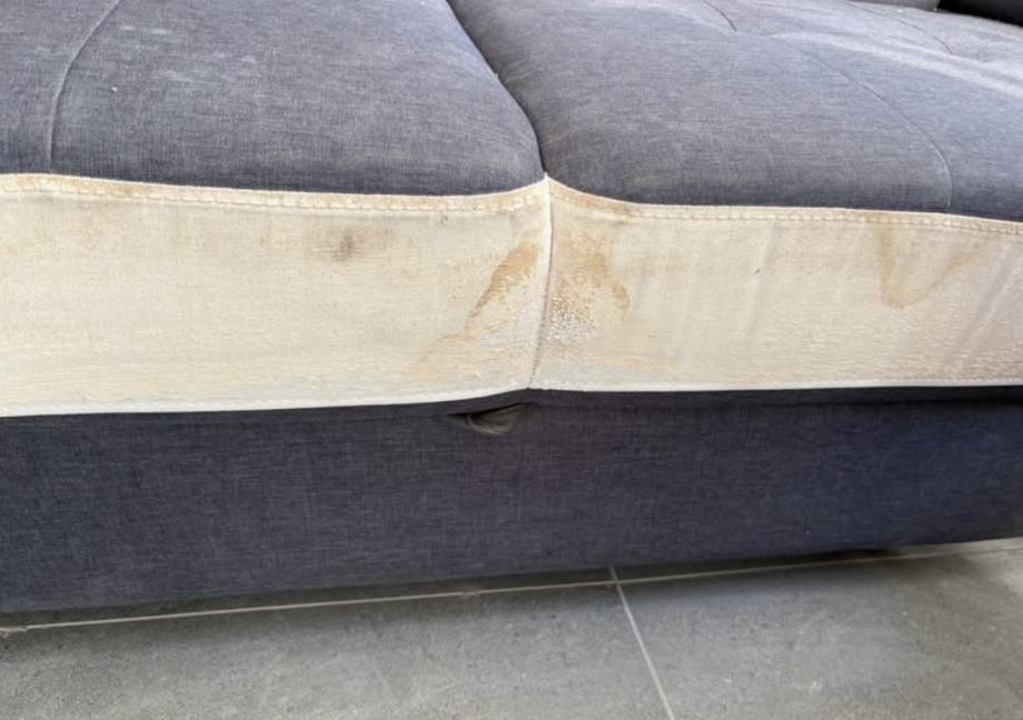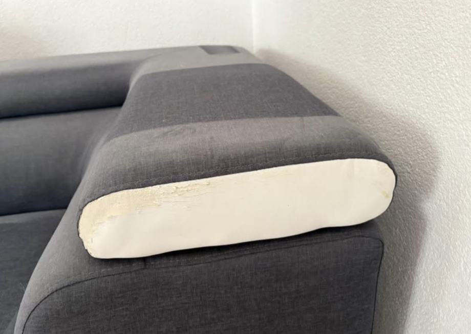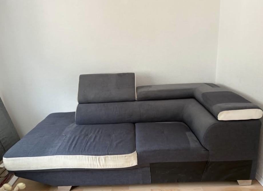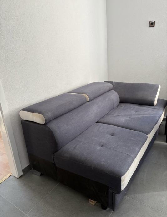 Za simbolično ceno prodam sedežno garnituro. L postavitev. Ima izvlečni predal, ki se raztegne v ležišče. Sedežna je globinsko očiščena (na fotografijah še ni). Poškodovan oziroma slabo ohranjen je bel del (glej fotografije).