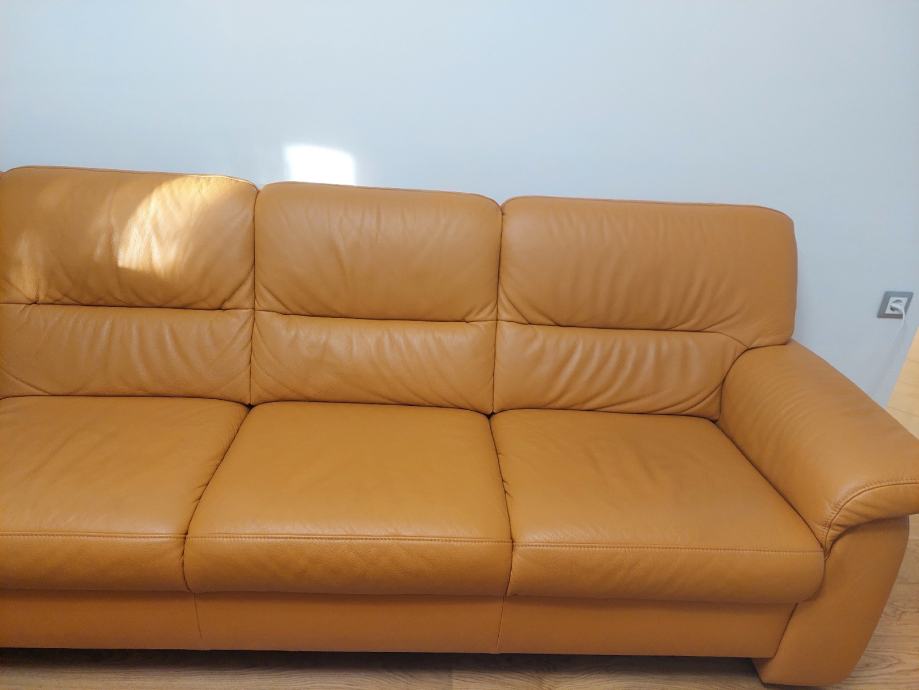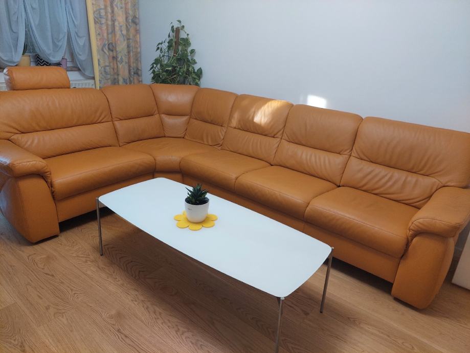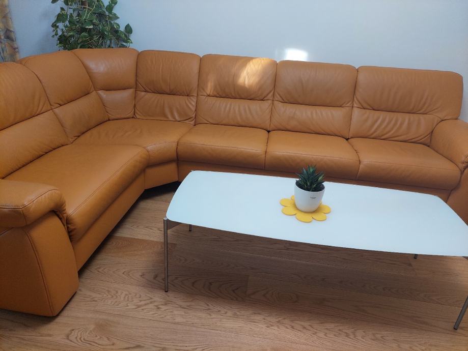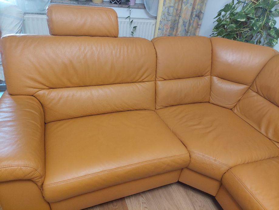 Zaradi adaptacije prodamo skoraj novo vrhunsko usnjeno sedežno kotno garnituro Himolla, nemskega proizvajalca, kamelje barve, mere cca. 3,20 x 2, 10 m brez poskodb, kupljena v Lesnini. Ima dodatno naslonjalo za glavo in dva naslona za nasloniti se.
