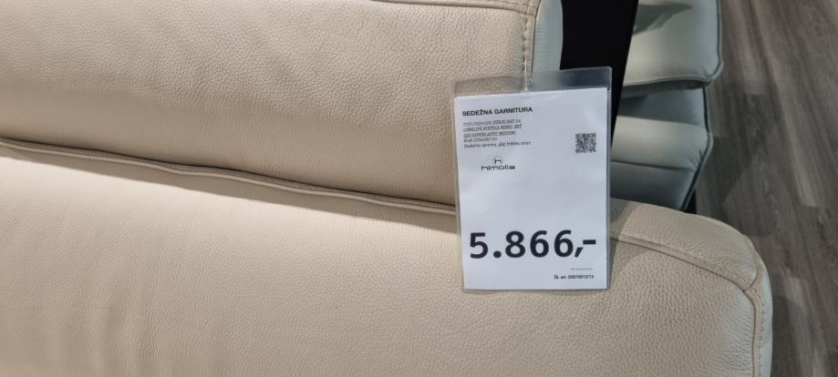Na prvi sliki je svetla sedezna prikazana kot informacija, da jo prodajajo v Lesnini, s ceno. Predmet prodaje je sedezna v kamelji barvi po vec kot polovicni ceni nove.