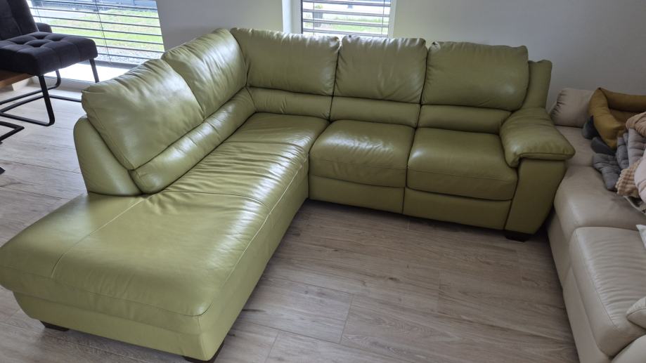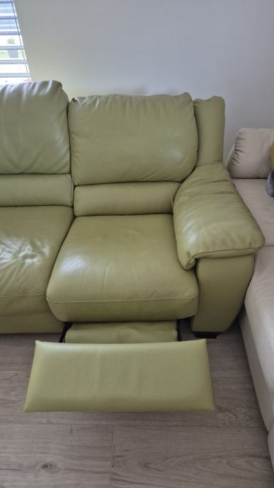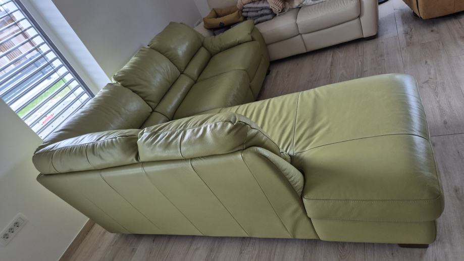 Usnjena sedežna garnitura Venuzzi, dimenzije 220 cm x 220 cm, svetlo zelene barve, z izvlečnim počivalnikom, zelo dobro ohranjena. Informacije 041 309 800.