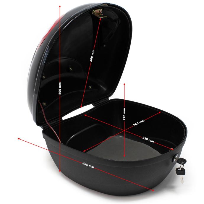 Zaradi zunanjih dimenzij 380 x 400 x 300 mm in notranjih dimenzij 360 x 330 x 270 mm je ta kovček za motorno kolo popoln spremljevalec. Zahvaljujoč teži le približno 2 kg in maksimalni obremenitvi približno 5 kg je izjemno priročen in hkrati prostoren.