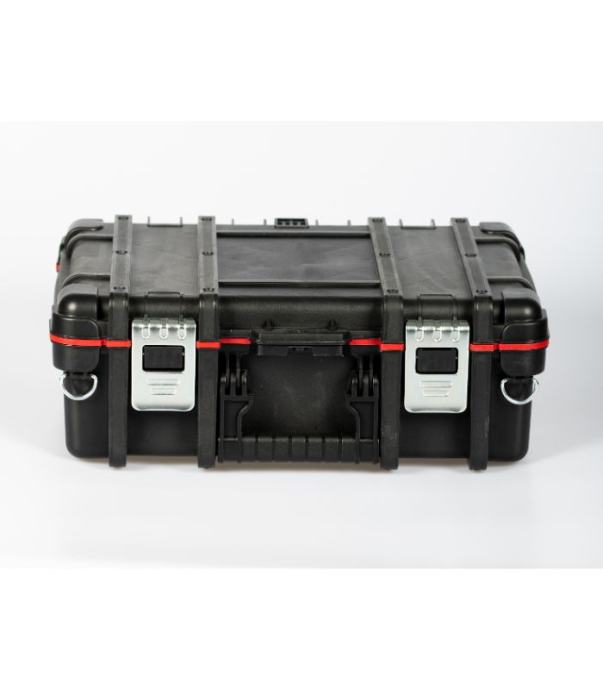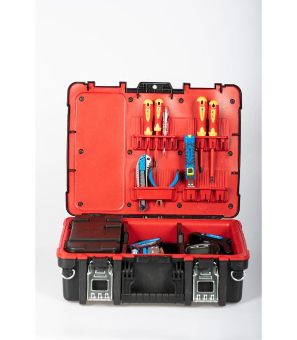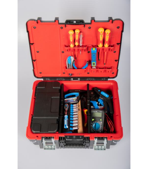 • Priročen in trden kovček za orodje je izdelan iz trpežne plastike in ima aluminijaste spone.