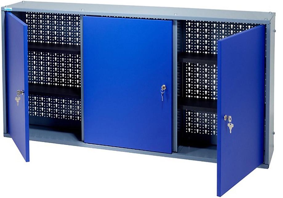 Ta viseča omarica s trojnimi vrati Küpper, s tremi zadnjimi stenami z luknjami in štirimi policami vam zagotavlja veliko prostora za vaše orodje.Oprema: 3 vrata, 3 zadnje stene z luknjami, 4 policeMere: 1200 mm x 600 mm x 190 mmMasa: 19 kg