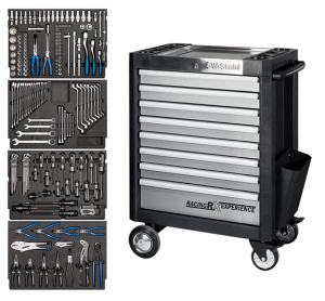 Voziček za orodje. Ima 8 predalov. Opremljen je z 181 orodji premium kakovosti. ( 4 predali) Vsebujejo 95 kosov nasadnih ključev, 35 kosov ključev z visoko kakovostjo z vložki za ključe, 38 kosov izvijaček visoke kakovosti Racing Experience nemške proizvodnje, 13 kosov klešč s kakovostjo Racing Experience. Notranje mere predala 410 x 570 mm. Dolžina 770 mm. Širina 530 mm. Višina 990 mm. Teža 80 kg.
