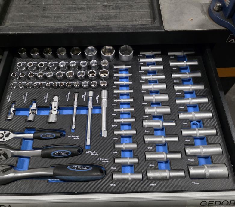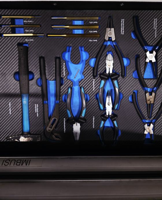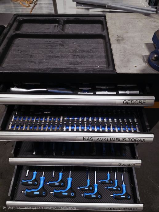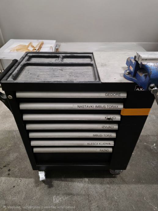 Zgornja alu površina, delno inox naknadno narejeno s škripcem BAHCO, šest velikih predalov, zaklepanje, kolesa z zavorami.