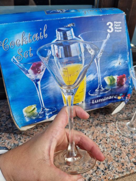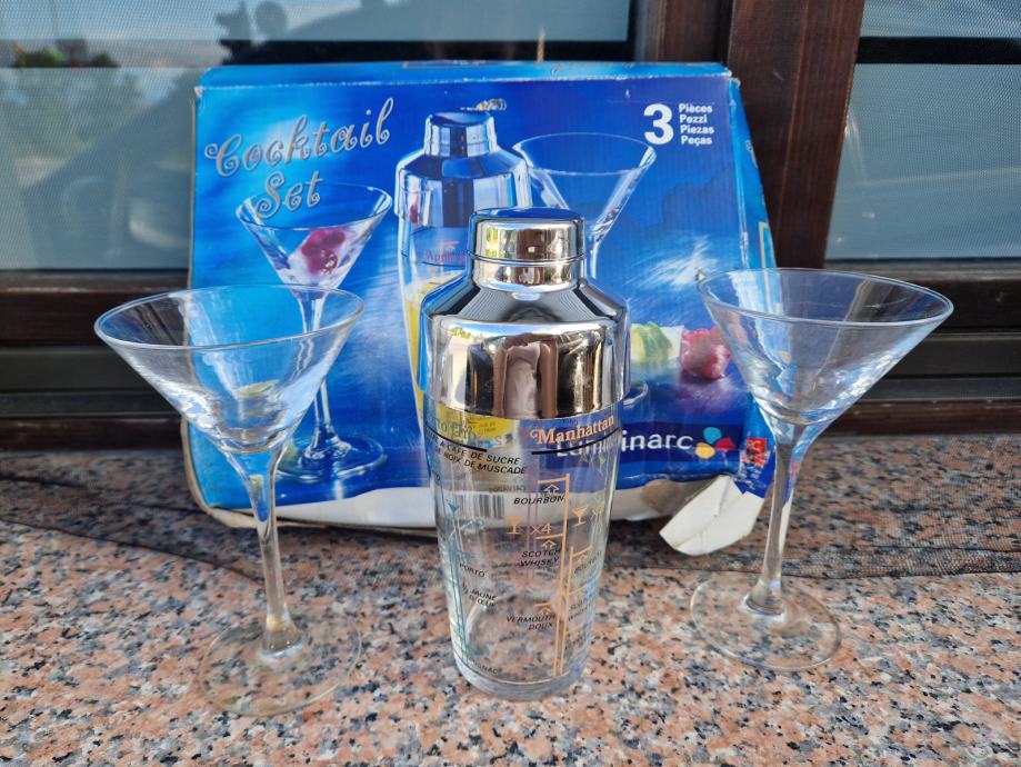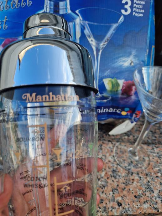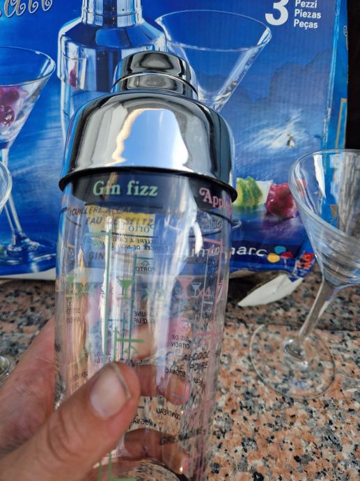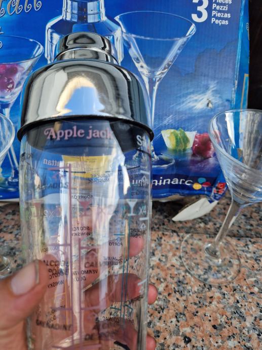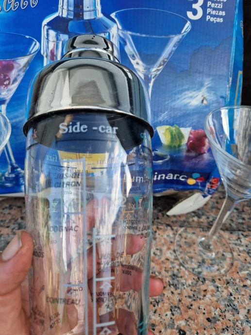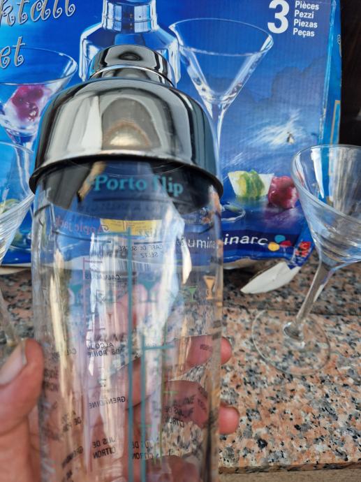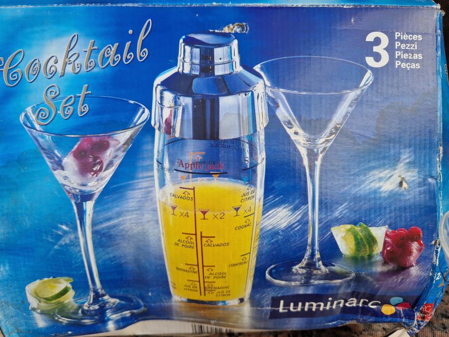 Prodam nov komplet za mešanje koktejlov. V kompletu dva kozarca in mikser na katerem navedene mešanice in doze za različne koktejle. Škatla sicer v slabšem stanju, kozarca in mikser nepoškodovani.