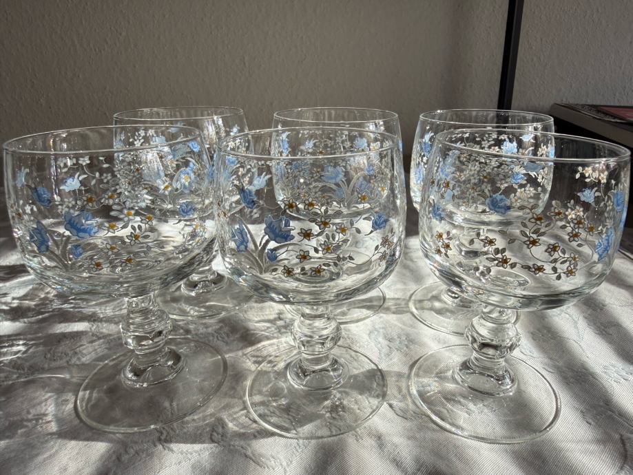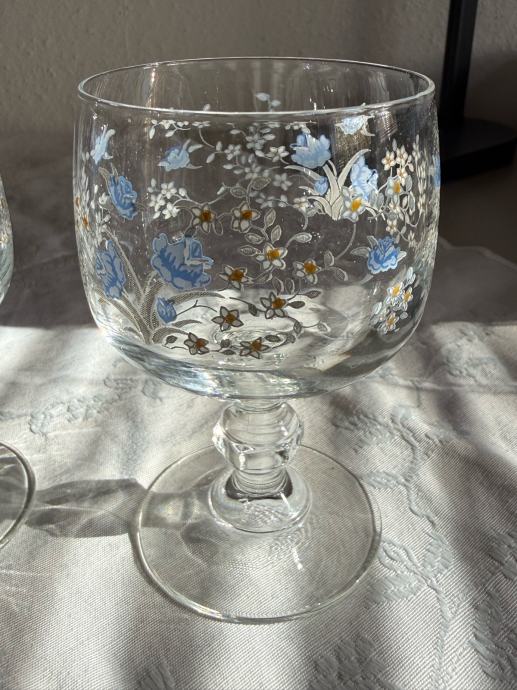 Prodajam čudovite vinske kozarce z ročno poslikavo modrih cvetličnih in belih detajlov. Elegantni kozarci imajo klasično obliko na peclju in so odlično ohranjeni. Edinstveni vzorec nežnih modrih cvetic naredi te kozarce popoln dodatek za vsako posebno priložnost ali kot dekorativen element v domu.