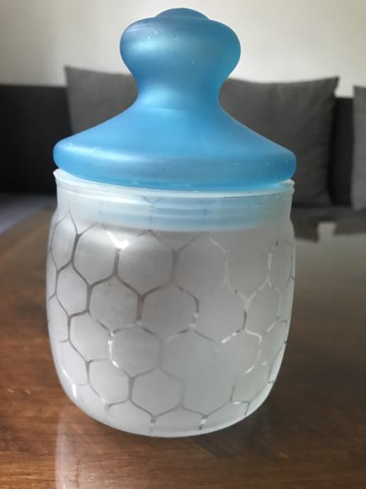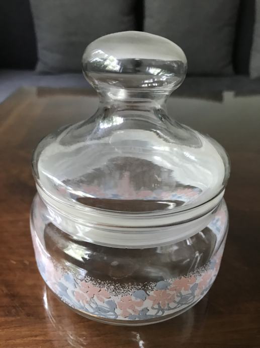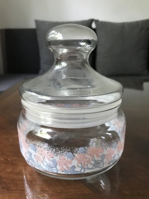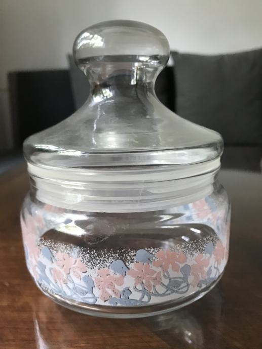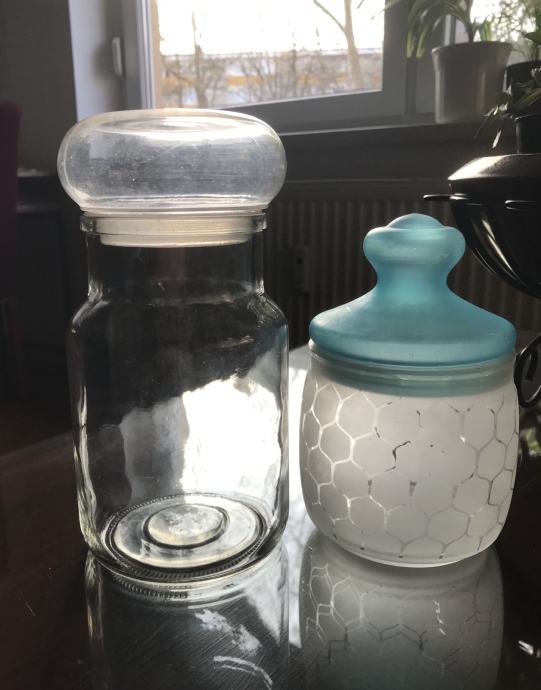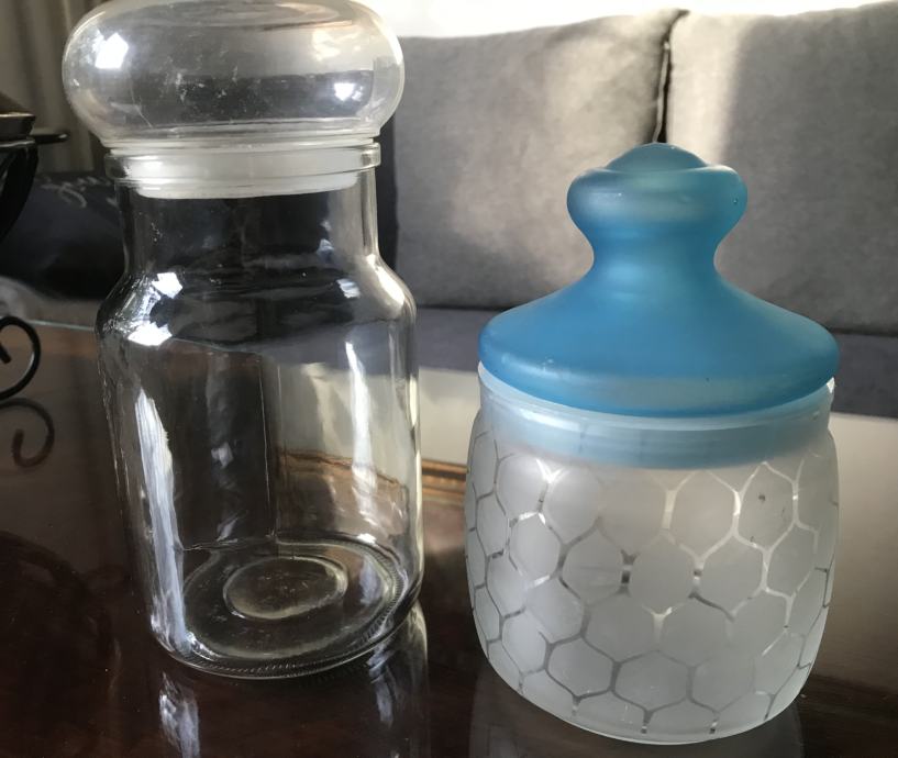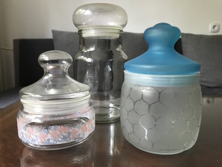 Prodam steklene posode - doze za shranjevanje soli, sladkorja, kave in drugega. Prva z modrim pokrovom je visoka 16 cm, druga z roza cvetlično verigo je visoka 13 cm, tretja pa je visoka 20 centimetrov. Tretjo brez okrasja lahko poslikate s poljubnimi, priljubljenimi motivi.